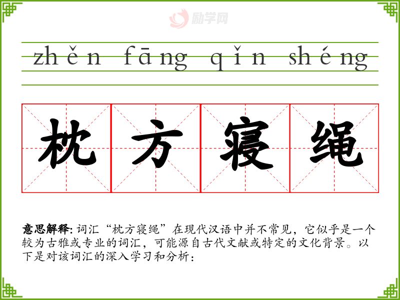 词汇“枕方寝绳”在现代汉语中并不常见,它似乎是一个较为古雅或专业的词汇,可能源自古代文献或特定的文化背景。以下是对该词汇的深入学习和分析: