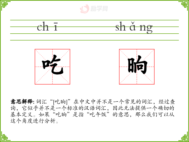 词汇“[吃晌]”在中文中并不是一个常见的词汇,经过查询,它似乎并不是一个标准的汉语词汇,因此无法提供一个确切的基本定义。如果“吃晌”是指“吃午饭”的意思,那么我们可以从这个角度进行分析。