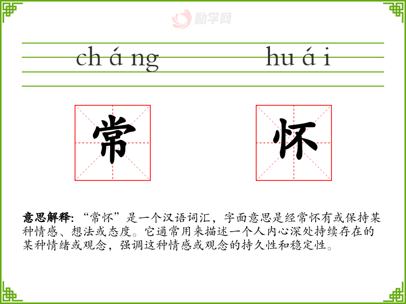 “常怀”由“常”和“怀”两个字组成。“常”字古汉语中意为恒常、不变,“怀”字则有怀抱、怀藏之意。这两个字结合,形成了表示持续怀有某种情感或观念的词汇。