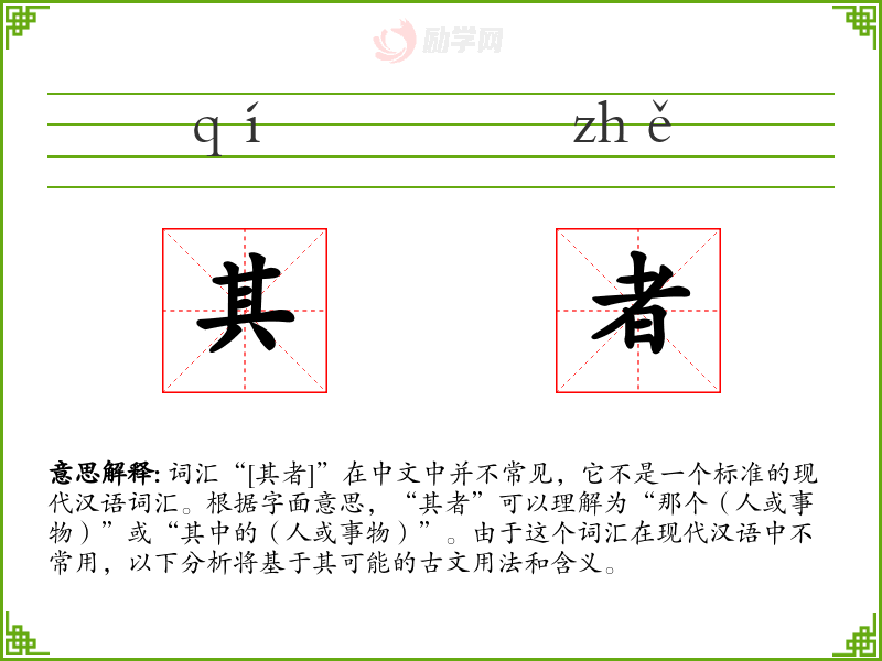 词汇“[其者]”在中文中并不常见,它不是一个标准的现代汉语词汇。根据字面意思,“其者”可以理解为“那个(人或事物)”或“其中的(人或事物)”。由于这个词汇在现代汉语中不常用,以下分析将基于其可能的古文用法和含义。