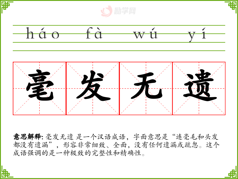 毫发无遗 是一个汉语成语,字面意思是“连毫毛和头发都没有遗漏”,形容非常细致、全面,没有任何遗漏或疏忽。这个成语强调的是一种极致的完整性和精确性。