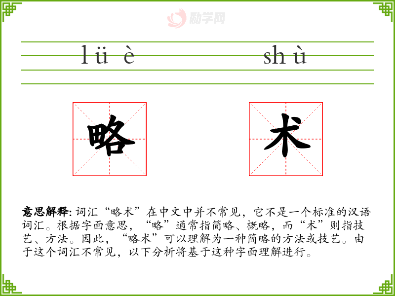 词汇“略术”在中文中并不常见,它不是一个标准的汉语词汇。根据字面意思,“略”通常指简略、概略,而“术”则指技艺、方法。因此,“略术”可以理解为一种简略的方法或技艺。由于这个词汇不常见,以下分析将基于这种字面理解进行。