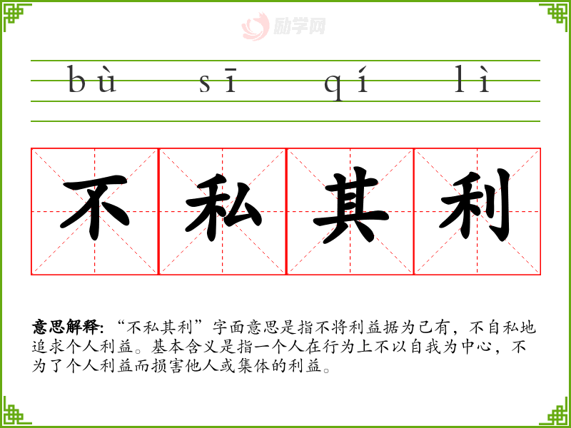 “不私其利”字面意思是指不将利益据为己有,不自私地追求个人利益。基本含义是指一个人在行为上不以自我为中心,不为了个人利益而损害他人或集体的利益。