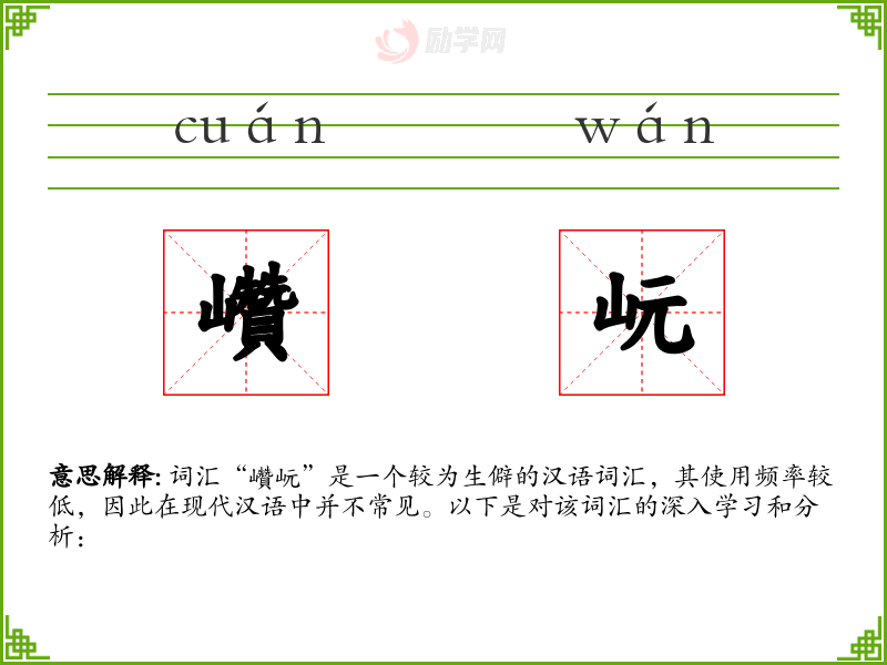词汇“巑岏”是一个较为生僻的汉语词汇,其使用频率较低,因此在现代汉语中并不常见。以下是对该词汇的深入学*和分析: