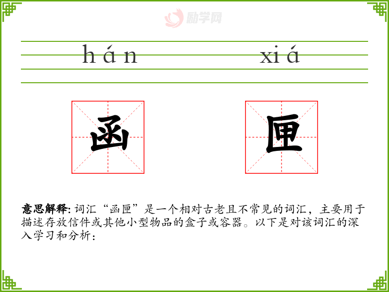 - 理解:函匣是一个具有历史和文化价值的词汇,虽然在现代汉语中使用较少,但在文学和历史研究中仍具有重要意义。