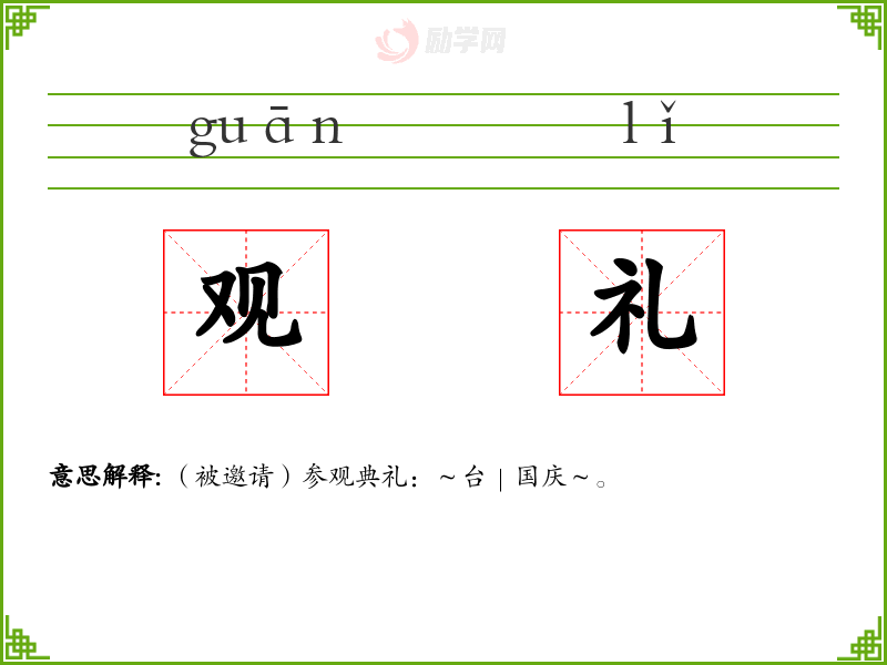 观礼的意思是:(被邀请)参观典礼:~台|国庆~。