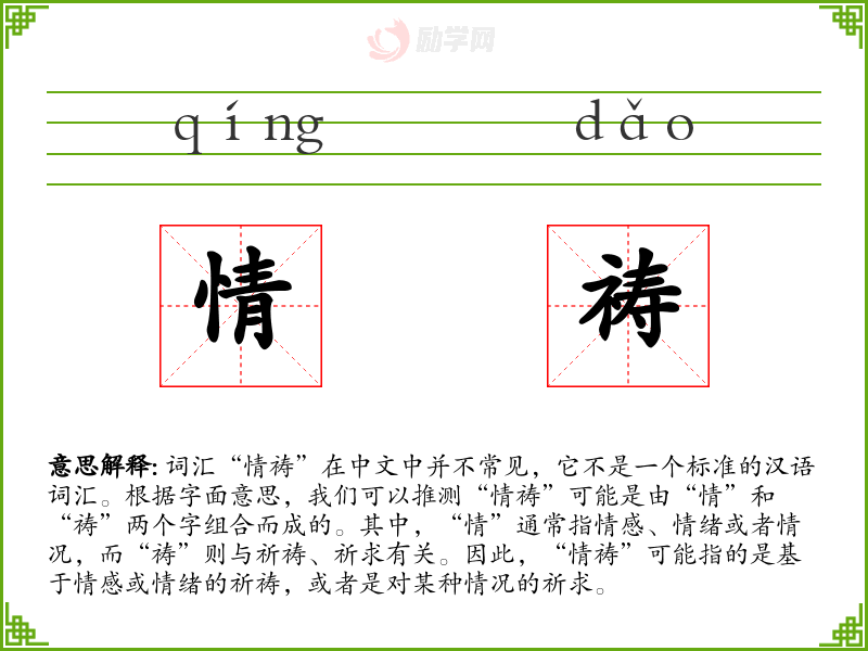 “情祷”这个词虽然不常见,但它提供了一个表达深切情感和真诚祈求的词汇。在语言学*和表达中,了解和掌握这样的词汇可以帮助我们更丰富地表达情感和思想。