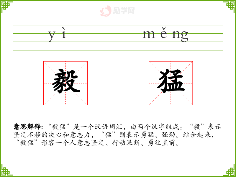 “毅猛”是一个汉语词汇,由两个汉字组成:“毅”表示坚定不移的决心和意志力,“猛”则表示勇猛、强劲。结合起来,“毅猛”形容一个人意志坚定、行动果断、勇往直前。