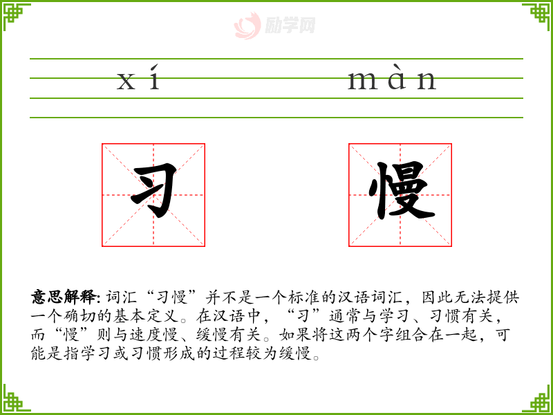 词汇“习慢”并不是一个标准的汉语词汇,因此无法提供一个确切的基本定义。在汉语中,“习”通常与学习、习惯有关,而“慢”则与速度慢、缓慢有关。如果将这两个字组合在一起,可能是指学习或习惯形成的过程较为缓慢。