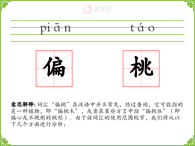 词汇“偏桃”在汉语中并不常见,经过查询,它可能指的是一种植物,即“偏桃木”,或者在某些方言中指“偏桃体”(即偏心或不规则的桃形)。由于该词汇的使用范围较窄,我们将从以下几个方面进行分析: