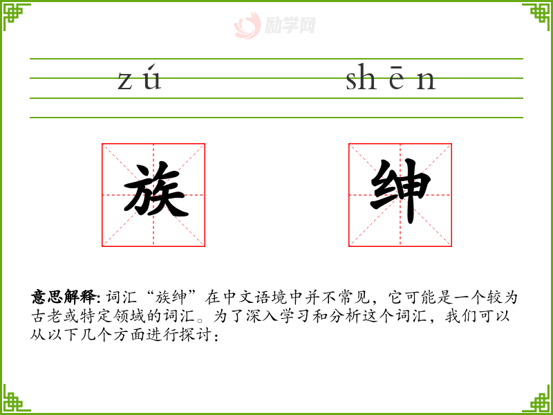 词汇“族绅”在中文语境中并不常见,它可能是一个较为古老或特定领域的词汇。为了深入学*和分析这个词汇,我们可以从以下几个方面进行探讨: