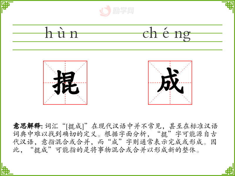 词汇“[掍成]”在现代汉语中并不常见,甚至在标准汉语词典中难以找到确切的定义。根据字面分析,“掍”字可能源自古代汉语,意指混合或合并,而“成”字则通常表示完成或形成。因此,“掍成”可能指的是将事物混合或合并以形成新的整体。