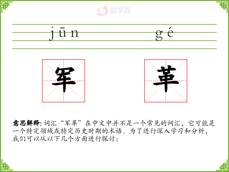 词汇“军革”在中文中并不是一个常见的词汇,它可能是一个特定领域或特定历史时期的术语。为了进行深入学*和分析,我们可以从以下几个方面进行探讨: