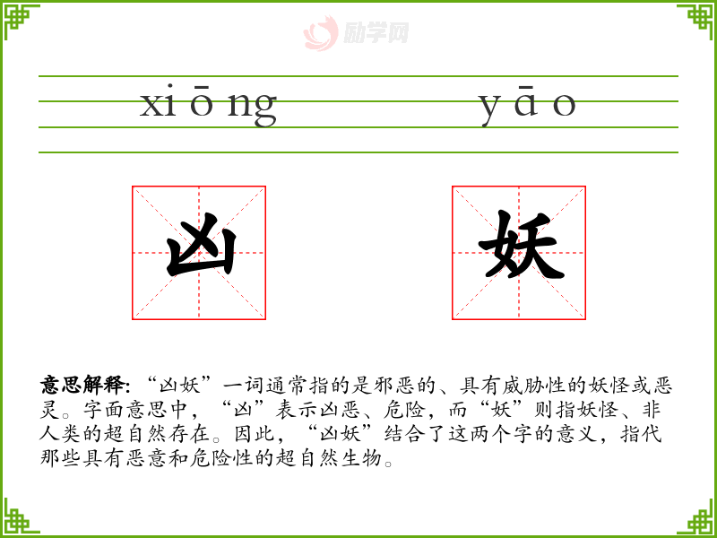 “凶妖”一词通常指的是邪恶的、具有威胁性的妖怪或恶灵。字面意思中,“凶”表示凶恶、危险,而“妖”则指妖怪、非人类的超自然存在。因此,“凶妖”结合了这两个字的意义,指代那些具有恶意和危险性的超自然生物。