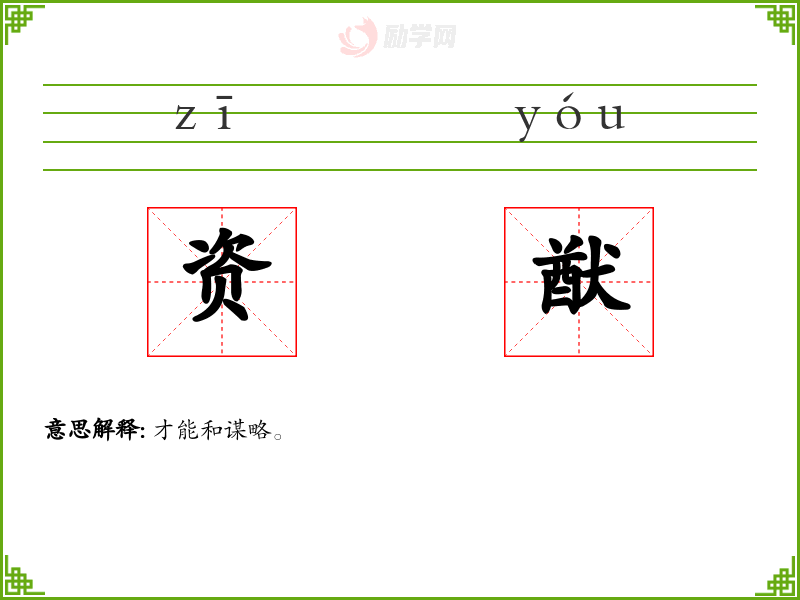 《说文》-资,货也。 《广雅》-资,川也。 《易·旅》-怀其资 《诗·大雅·板》-丧乱蔑资。 《战国策·秦策一》-资用乏绝,去秦而归。 《战国策·燕策》-既至秦,持千金之资币物,厚遗秦王宠臣中庶子蒙嘉。 明·李渔《闲情偶寄·种植部》-应得之资。 《广东军务记》-富者捐资。 清·方苞《狱中杂记》-中家以上,皆竭资取得。 清·周容《芋老人传》-厚资而遣之。