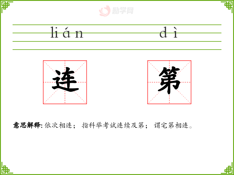 连第的意思是:依次相连; 指科举考试连续及第; 谓宅第相连。