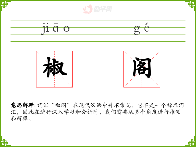 - 反义词:无(由于“椒阁”不是一个常用词汇,反义词难以确定)