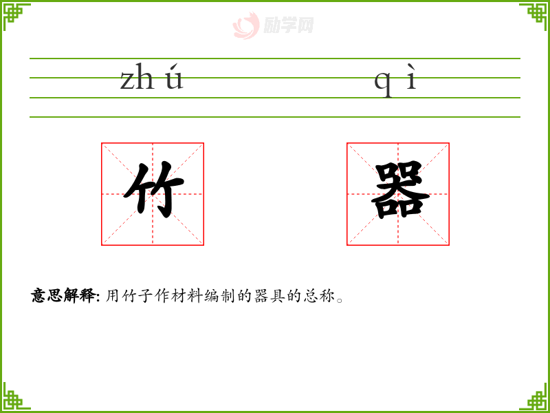 竹器的意思是:用竹子作材料编制的器具的总称。