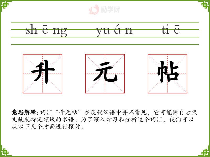 词汇“升元帖”在现代汉语中并不常见,它可能源自古代文献或特定领域的术语。为了深入学*和分析这个词汇,我们可以从以下几个方面进行探讨: