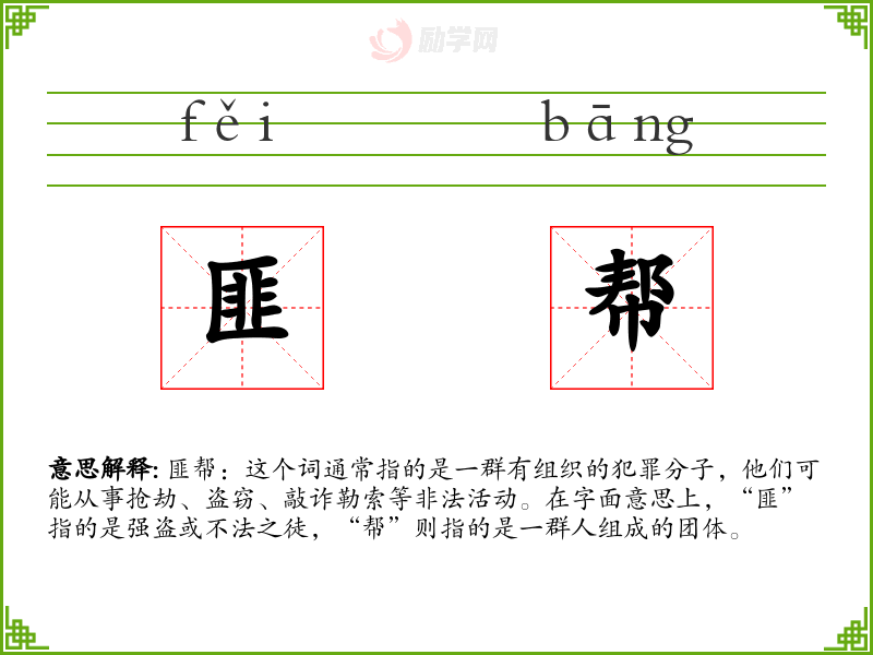 匪帮:这个词通常指的是一群有组织的犯罪分子,他们可能从事抢劫、盗窃、敲诈勒索等非法活动。在字面意思上,“匪”指的是强盗或不法之徒,“帮”则指的是一群人组成的团体。