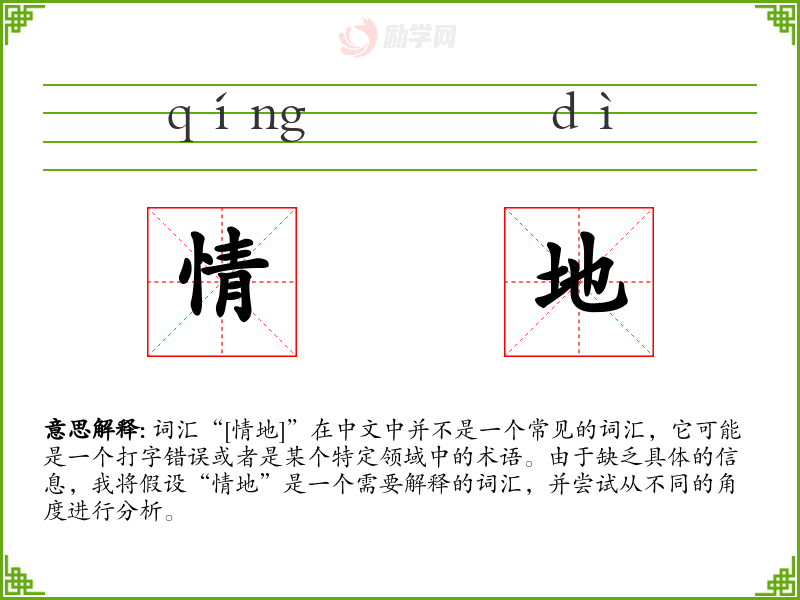 由于“情地”不是一个标准词汇,我们无法提供一个确切的字面意思和基本含义。如果这是一个打字错误,它可能是指“情境”或“情调”等词汇。