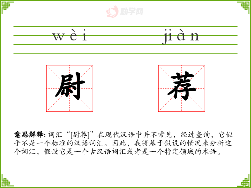词汇“[尉荐]”在现代汉语中并不常见,经过查询,它似乎不是一个标准的汉语词汇。因此,我将基于假设的情况来分析这个词汇,假设它是一个古汉语词汇或者是一个特定领域的术语。