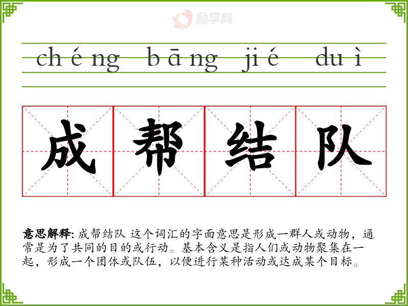 成帮结队 这个词汇的字面意思是形成一群人或动物,通常是为了共同的目的或行动。基本含义是指人们或动物聚集在一起,形成一个团体或队伍,以便进行某种活动或达成某个目标。