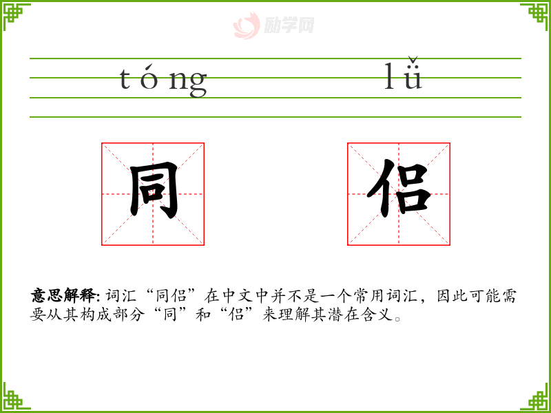 词汇“同侣”在中文中并不是一个常用词汇,因此可能需要从其构成部分“同”和“侣”来理解其潜在含义。