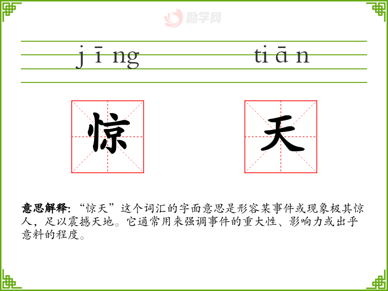 “惊天”这个词汇的字面意思是形容某或现象极其惊人,足以震撼天地。它通常用来强调的重大性、影响力或出乎意料的程度。