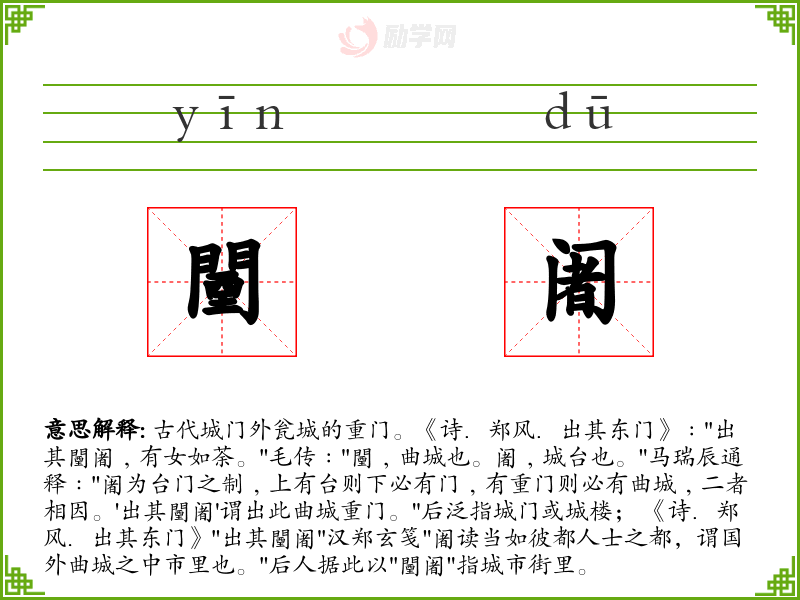 古代城门外瓮城的重门。《诗.郑风.出其东门》﹕"出其闉阇﹐有女如荼。"毛传﹕"闉﹐曲城也。阇﹐城台也。"马瑞辰通释﹕"阇为台门之制﹐上有台则下必有门﹐有重门则必有曲城﹐二者相因。'出其闉阇'谓出此曲城重门。"后泛指城门或城楼; 《诗.郑风.出其东门》"出其闉阇"汉郑玄笺"阇读当如彼都人士之都,谓国外曲城之中市里也。"后人据此以"闉阇"指城市街里。