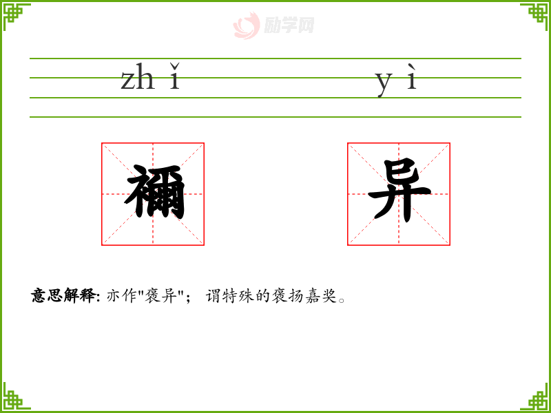襧异的意思是:亦作"褒异"; 谓特殊的褒扬嘉奖。