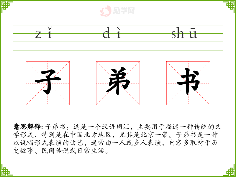 子弟书:这是一个汉语词汇,主要用于描述一种传统的文学形式,特别是在**北方地区,尤其是北京一带。子弟书是一种以说唱形式表演的曲艺,通常由一人或多人表演,内容多取材于历史故事、民间传说或日常生活。
