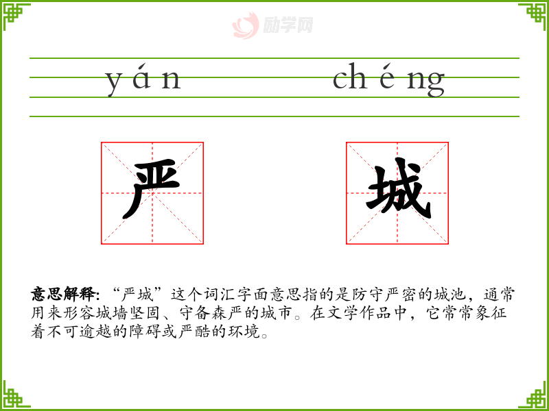 “严城”这个词汇字面意思指的是防守严密的城池,通常用来形容城墙坚固、守备森严的城市。在文学作品中,它常常象征着不可逾越的障碍或严酷的环境。