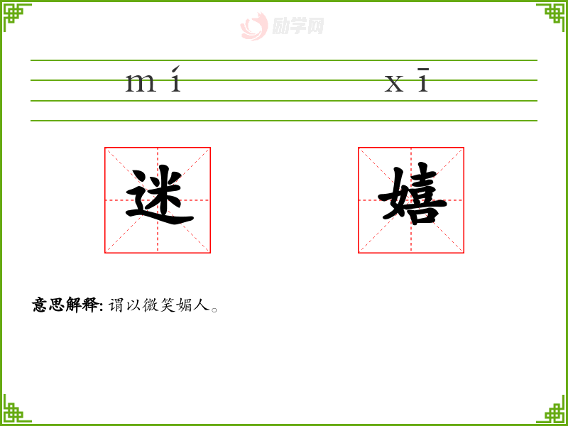 迷嬉的意思是:谓以微笑媚人。