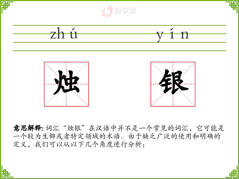 词汇“烛银”在汉语中并不是一个常见的词汇,它可能是一个较为生僻或者特定领域的术语。由于缺乏广泛的使用和明确的定义,我们可以从以下几个角度进行分析: