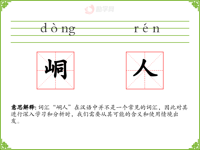 词汇“峒人”在汉语中并不是一个常见的词汇,因此对其进行深入学*和分析时,我们需要从其可能的含义和使用情境出发。