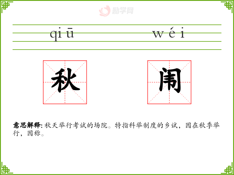 秋闱的意思是:秋天举行考试的场院。特指科举制度的乡试,因在秋季举行,因称。