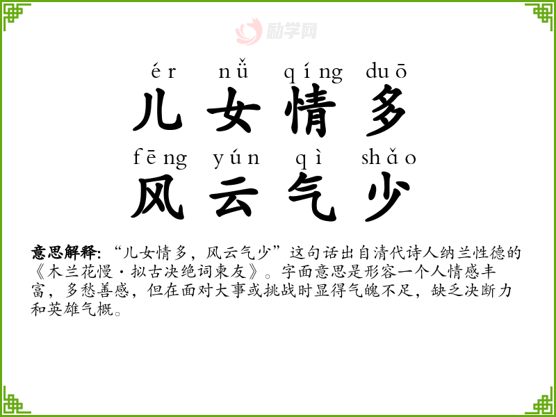 “儿女情多,风云气少”这句话深刻地揭示了性格的两个方面,提醒我们在欣赏细腻情感的同时,也要培养决断力和行动力。在语言学*和表达中,理解和运用这样的词汇能够丰富我们的表达方式,增强语言的深度和广度。