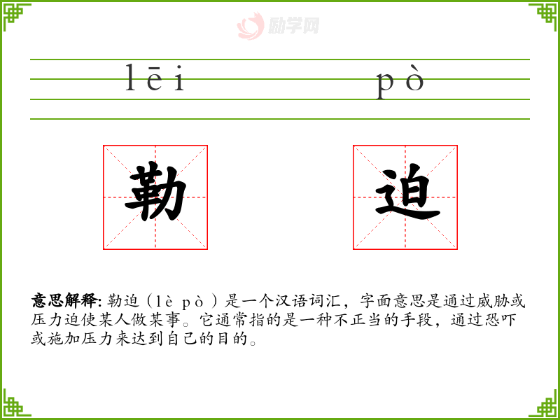 勒迫(lè pò)是一个汉语词汇,字面意思是通过威胁或压力迫使某人做某事。它通常指的是一种不正当的手段,通过恐吓或施加压力来达到自己的目的。