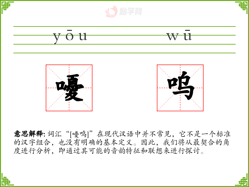 由于“[嚘呜]”不是一个标准的词汇,我们无法给出确切的字面意思和基本含义。它可能是一个拟声词,模仿某种声音,但由于缺乏具体的使用实例,我们无法确定其确切含义。