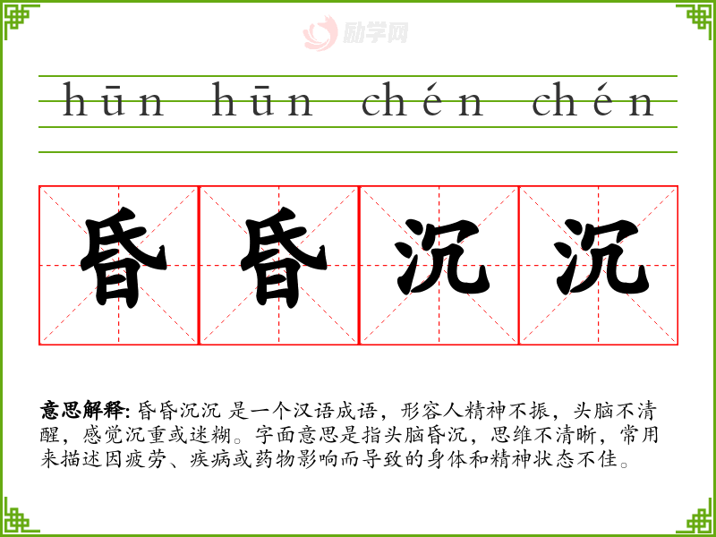 昏昏沉沉 是一个汉语成语,形容人精神不振,头脑不清醒,感觉沉重或迷糊。字面意思是指头脑昏沉,思维不清晰,常用来描述因疲劳、疾病或药物影响而导致的身体和精神状态不佳。