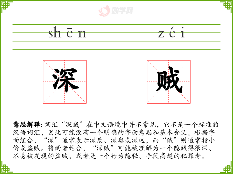词汇“深贼”在中文语境中并不常见,它不是一个标准的汉语词汇,因此可能没有一个明确的字面意思和基本含义。根据字面组合,“深”通常表示深度、深奥或深远,而“贼”则通常指小偷或盗贼。将两者结合,“深贼”可能被理解为一个隐藏得很深、不易被发现的盗贼,或者是一个行为隐秘、手段高超的犯罪者。