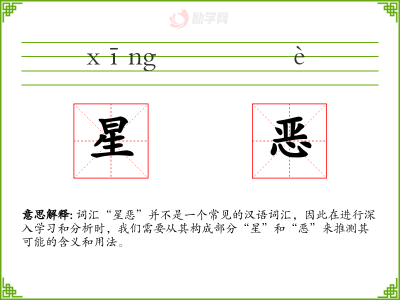 词汇“星恶”并不是一个常见的汉语词汇,因此在进行深入学*和分析时,我们需要从其构成部分“星”和“恶”来推测其可能的含义和用法。