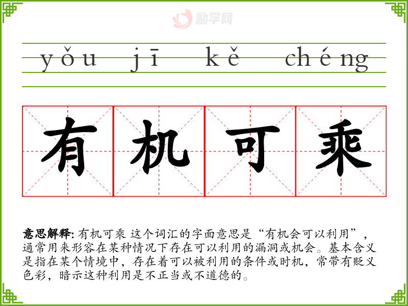 有机可乘 这个词汇的字面意思是“有机会可以利用”,通常用来形容在某种情况下存在可以利用的漏洞或机会。基本含义是指在某个情境中,存在着可以被利用的条件或时机,常带有贬义色彩,暗示这种利用是不正当或不道德的。