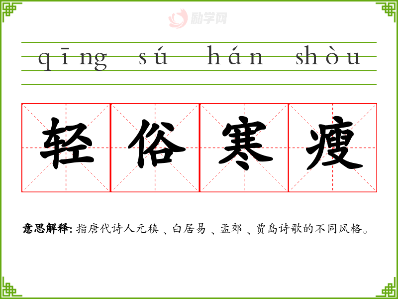 轻俗寒瘦的意思是:指唐代诗人元稹﹑白居易﹑孟郊﹑贾岛诗歌的不同风格。