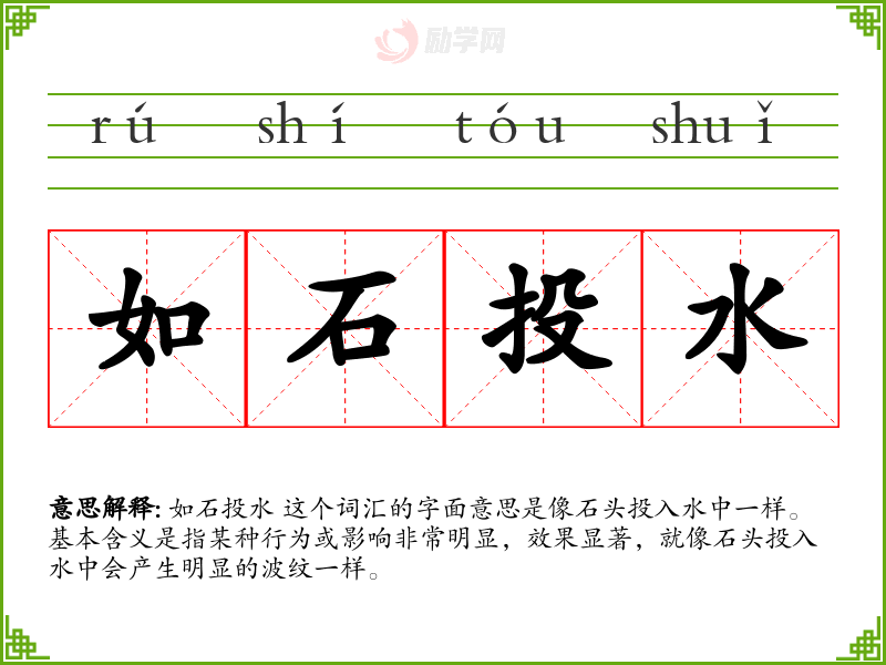 通过深入学*和分析“如石投水”这个词汇,我更加理解了它在不同语境下的使用和意义。这个词汇不仅丰富了我的语言表达,也让我对文化和语言的联系有了更深的认识。