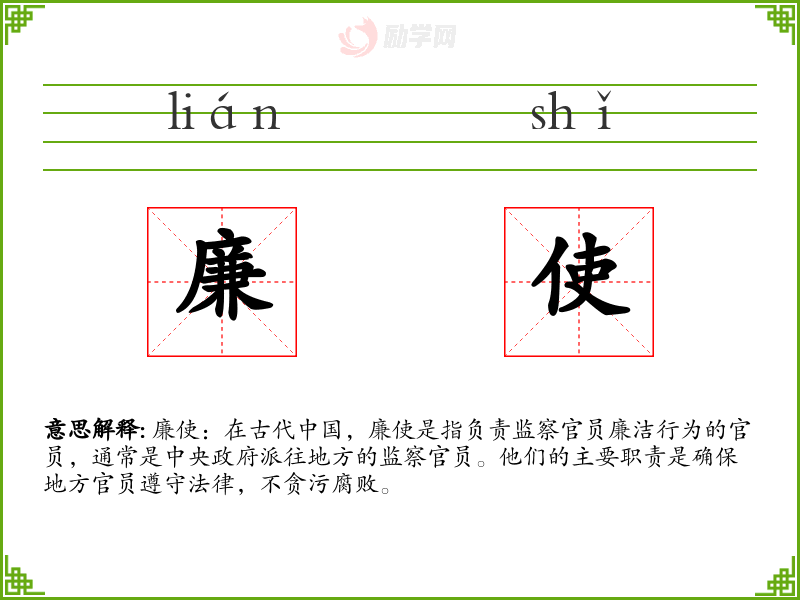 廉使:在古代**,廉使是指负责监察官员廉洁行为的官员,通常是中央政府派往地方的监察官员。他们的主要职责是确保地方官员遵守法律,不贪污腐败。