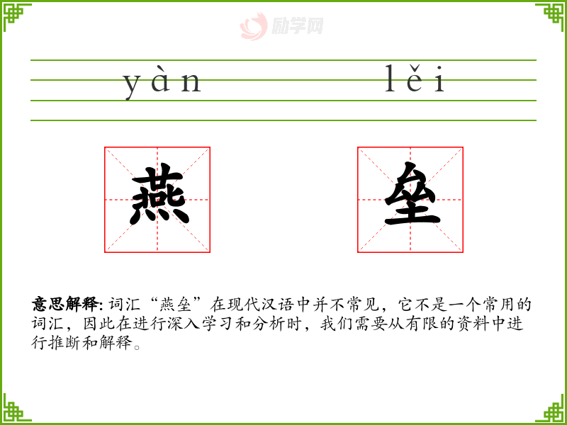 词汇“燕垒”在现代汉语中并不常见,它不是一个常用的词汇,因此在进行深入学*和分析时,我们需要从有限的资料中进行推断和解释。