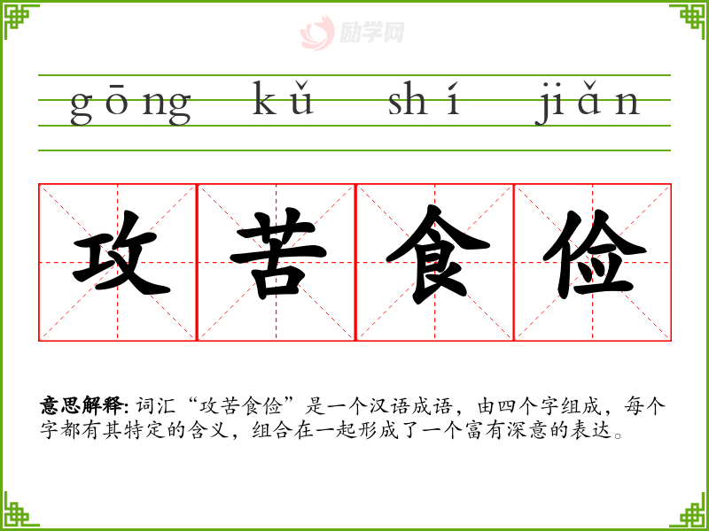 词汇“攻苦食俭”是一个汉语成语,由四个字组成,每个字都有其特定的含义,组合在一起形成了一个富有深意的表达。