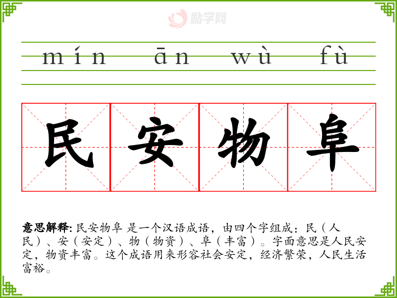 民安物阜 是一个汉语成语,由四个字组成:民(人民)、安(安定)、物(物资)、阜(丰富)。字面意思是人民安定,物资丰富。这个成语用来形容社会安定,经济繁荣,人民生活富裕。